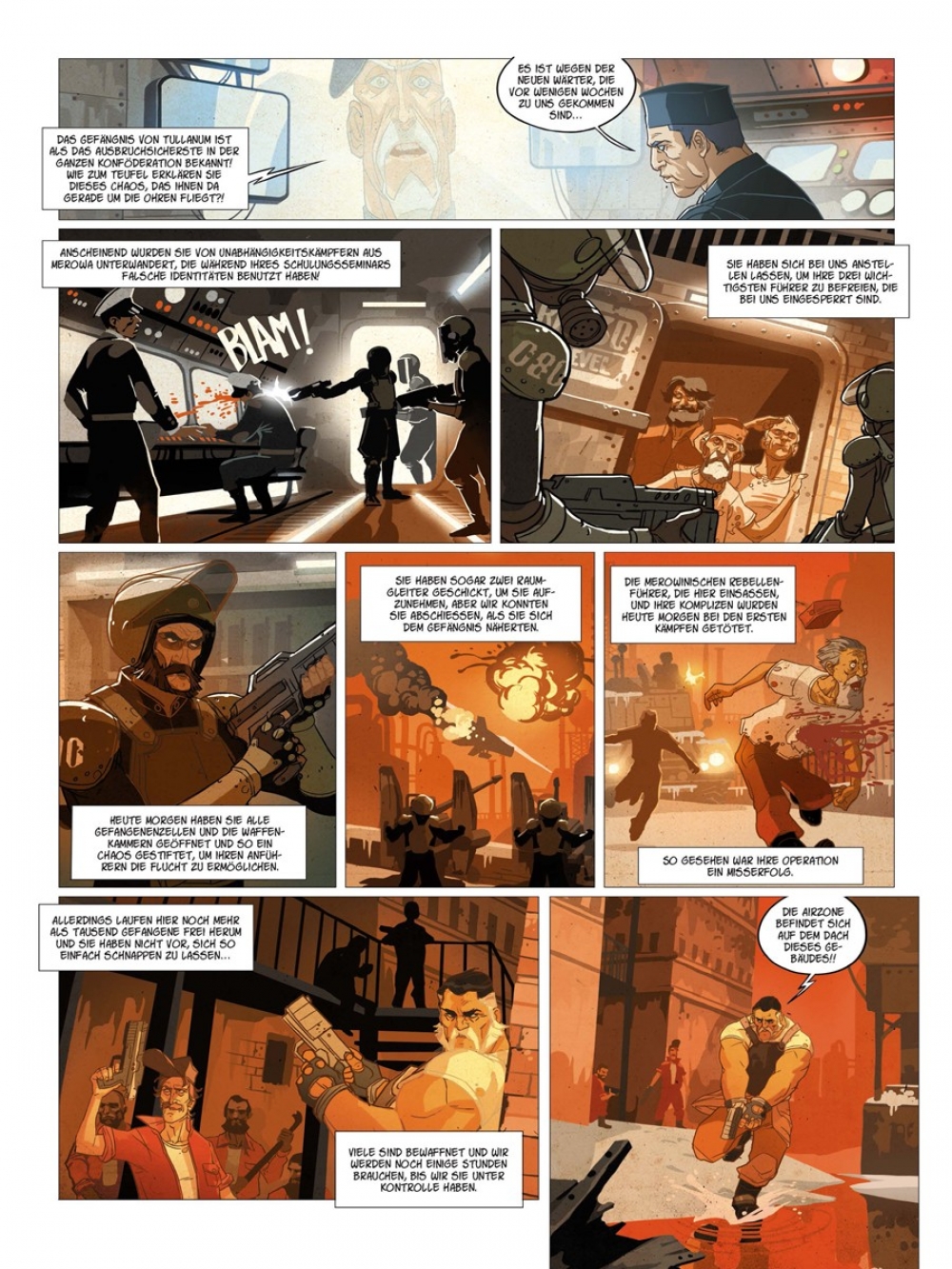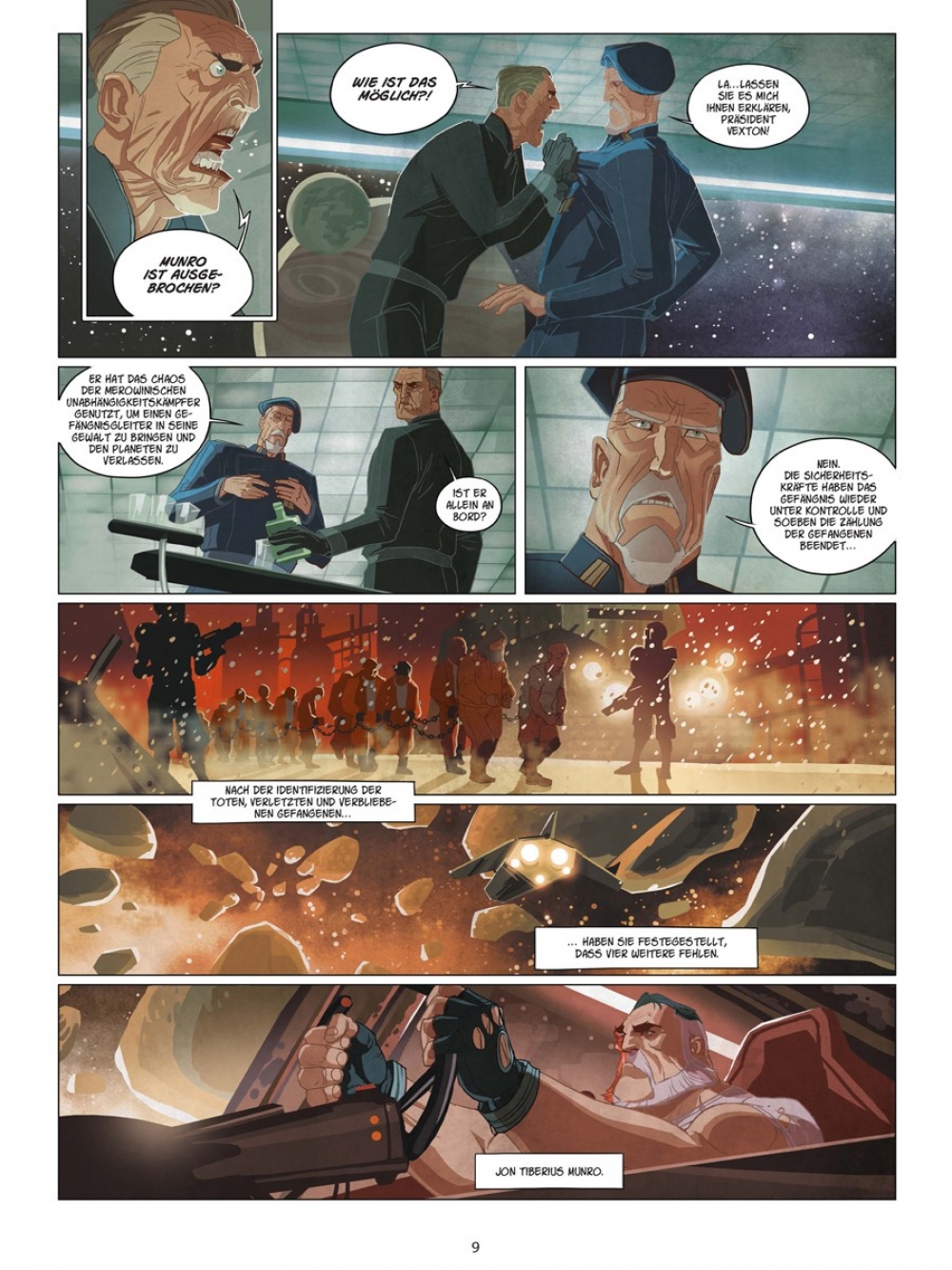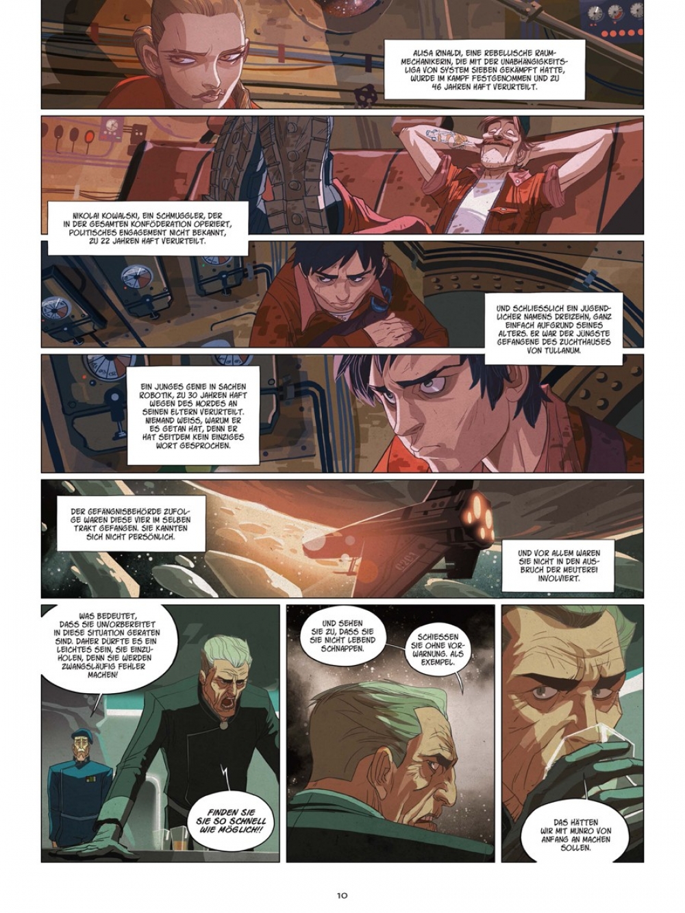Sylvain Runberg und Miki Montlló hätten keinen besseren Titel für ihre neue SF-Serie finden können! In einer Sternenföderation, die von Unabhängigkeitskämpfern gefährdet wird, brechen vier Strafgefangene aus, unter ihnen auch der Kriegsverbrecher Jon T. Munro. Der ehemalige Armeegeneral muss sich mit einem militanten Söldner, einem gewalttätigen Schmuggler und einem wortkargen Jugendlichen verbünden, um sein Raumschiff, die Walküre, wieder in seine Gewalt zu bringen. Als Jon T. Munro bei einer Auseinandersetzung ein Auge verliert, ist das Dekor für die künftigen Space-Piraten perfekt. Das heißt beinahe, denn für das Raumschiff muss ein neuer Name her… Und welcher wäre für ein Piratenschiff besser geeignet als Jolly Roger?