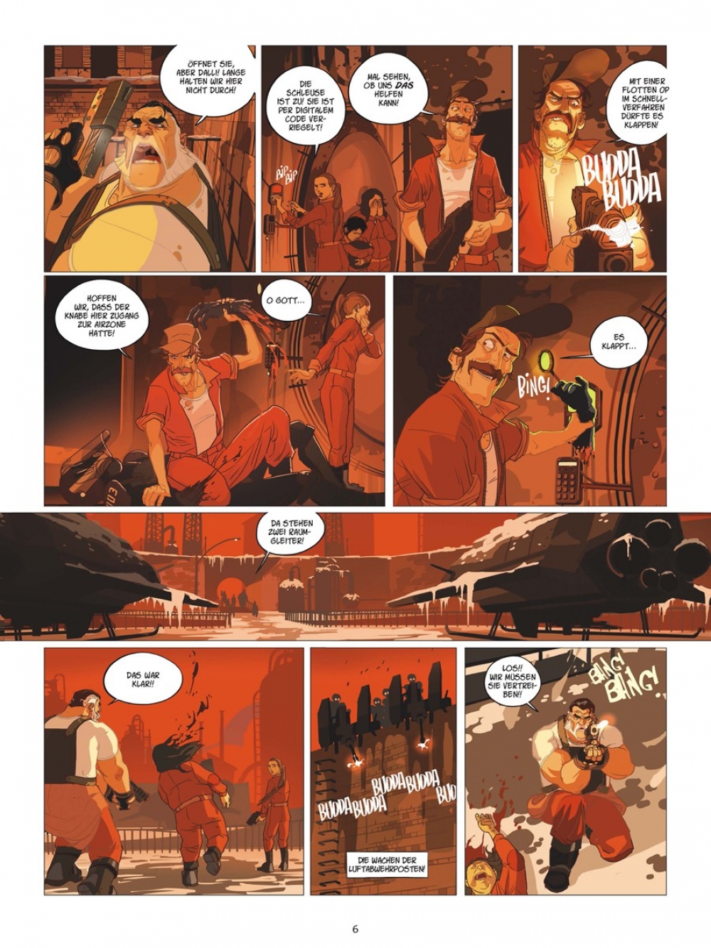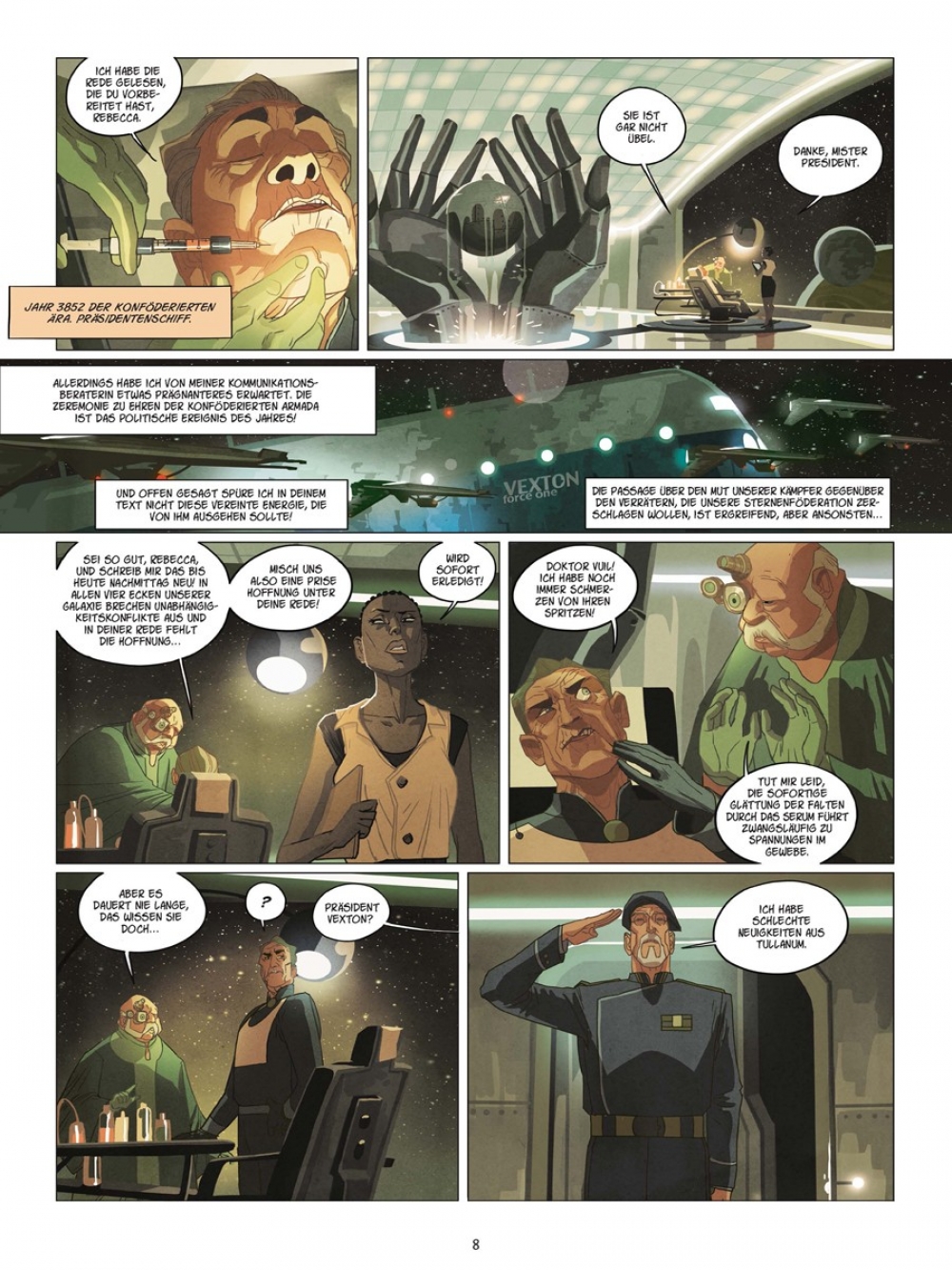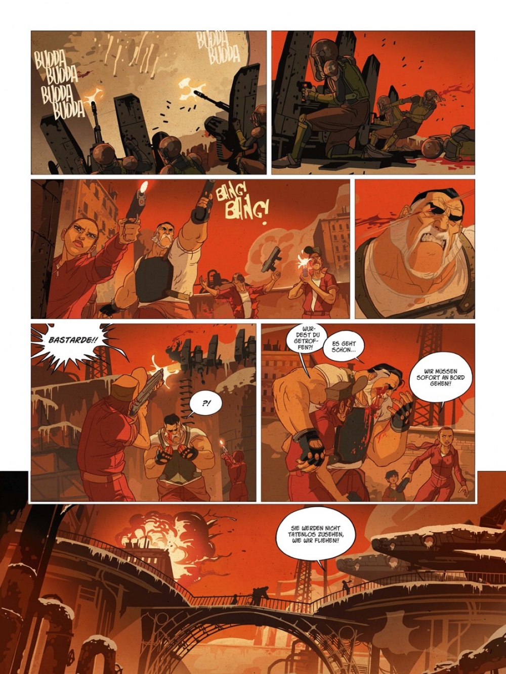 Sylvain Runberg und Miki Montlló hätten keinen besseren Titel für ihre neue SF-Serie finden können! In einer Sternenföderation, die von Unabhängigkeitskämpfern gefährdet wird, brechen vier Strafgefangene aus, unter ihnen auch der Kriegsverbrecher Jon T. Munro. Der ehemalige Armeegeneral muss sich mit einem militanten Söldner, einem gewalttätigen Schmuggler und einem wortkargen Jugendlichen verbünden, um sein Raumschiff, die Walküre, wieder in seine Gewalt zu bringen. Als Jon T. Munro bei einer Auseinandersetzung ein Auge verliert, ist das Dekor für die künftigen Space-Piraten perfekt. Das heißt beinahe, denn für das Raumschiff muss ein neuer Name her… Und welcher wäre für ein Piratenschiff besser geeignet als Jolly Roger?