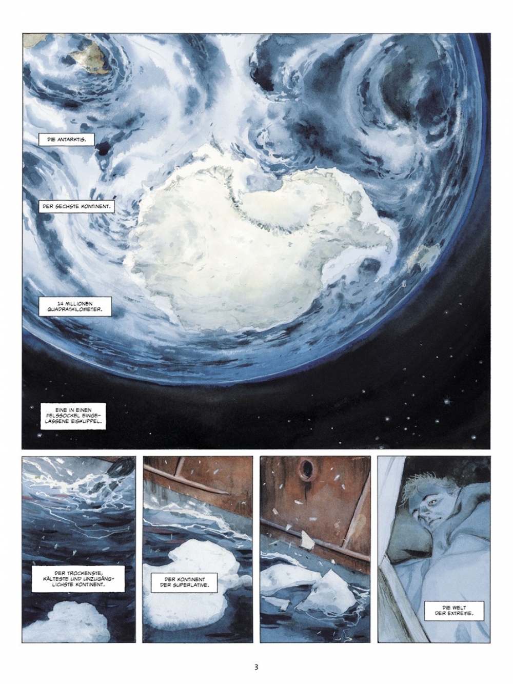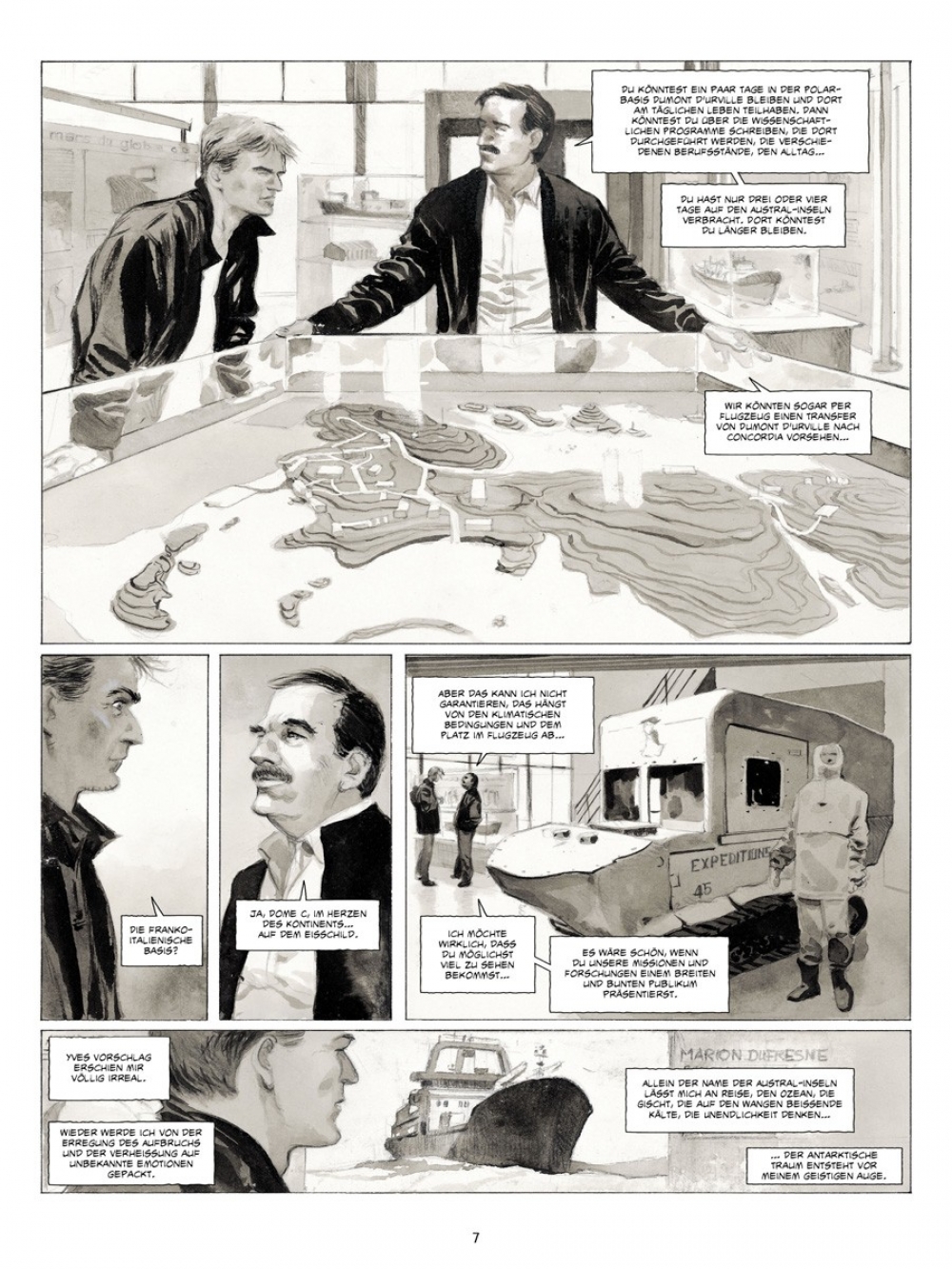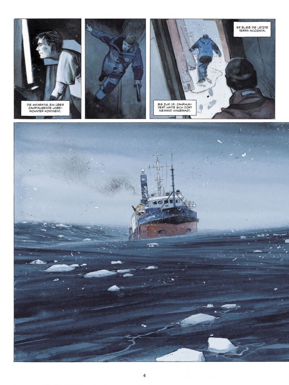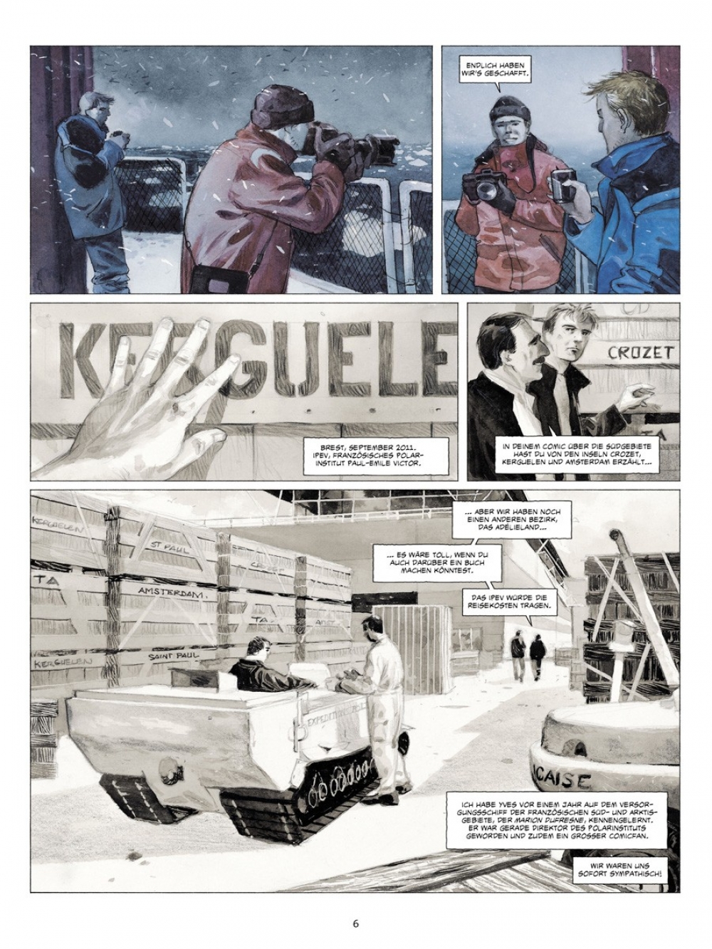 Wieder das Meer, die Kälte ist schneidend und trocken, das Weiß makellos - die Eiswüste, die Welt der Extreme. Ein Jahr nach seiner Reise auf dem Versorgungsschiff Marion Dufresne in die Französischen Süd- und Antarktisgebiete wird Emmanuel Lepage erneut zu einer Expedition ins große „A“ eingeladen, an einen Ort, den er während seines Besuchs in den TAAF (Terres Australes Françaises) nicht aufgesucht hatte: die Antarktis! Yves, Direktor des IPEV (Institut Polaire Francais Paul Emile Victor) und Comic-Liebhaber, gibt dem Zeichner Gelegenheit, „über die wissenschaftlichen Pläne, die (…) geleitet werden, die Handwerker, das tägliche Leben“ auf der Dumont-d’Urville-Station im Adelieland zu berichten.