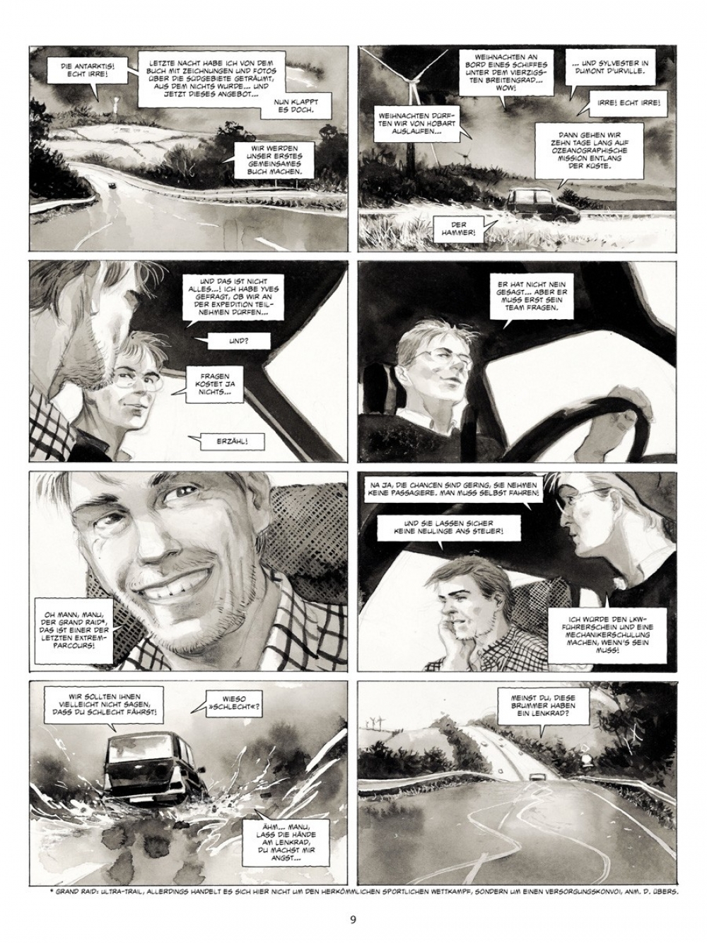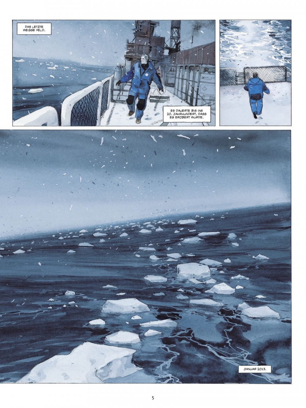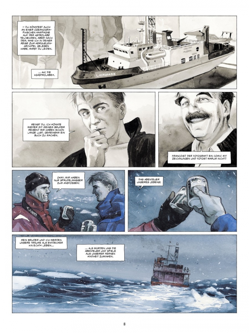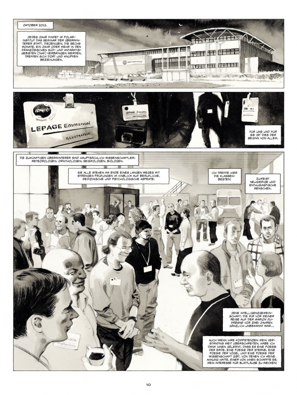 Wieder das Meer, die Kälte ist schneidend und trocken, das Weiß makellos - die Eiswüste, die Welt der Extreme. Ein Jahr nach seiner Reise auf dem Versorgungsschiff Marion Dufresne in die Französischen Süd- und Antarktisgebiete wird Emmanuel Lepage erneut zu einer Expedition ins große „A“ eingeladen, an einen Ort, den er während seines Besuchs in den TAAF (Terres Australes Françaises) nicht aufgesucht hatte: die Antarktis! Yves, Direktor des IPEV (Institut Polaire Francais Paul Emile Victor) und Comic-Liebhaber, gibt dem Zeichner Gelegenheit, „über die wissenschaftlichen Pläne, die (…) geleitet werden, die Handwerker, das tägliche Leben“ auf der Dumont-d’Urville-Station im Adelieland zu berichten.