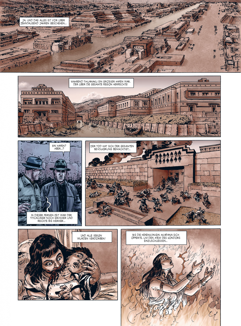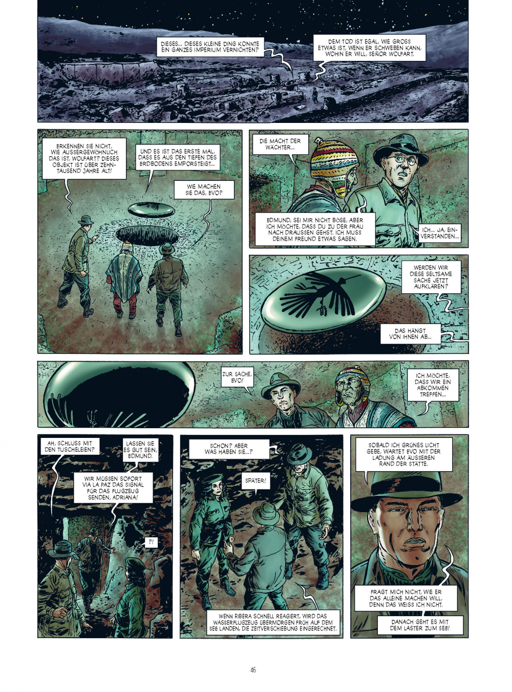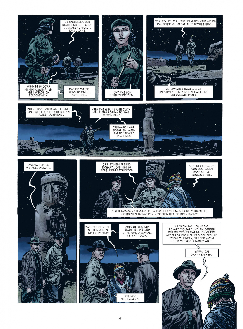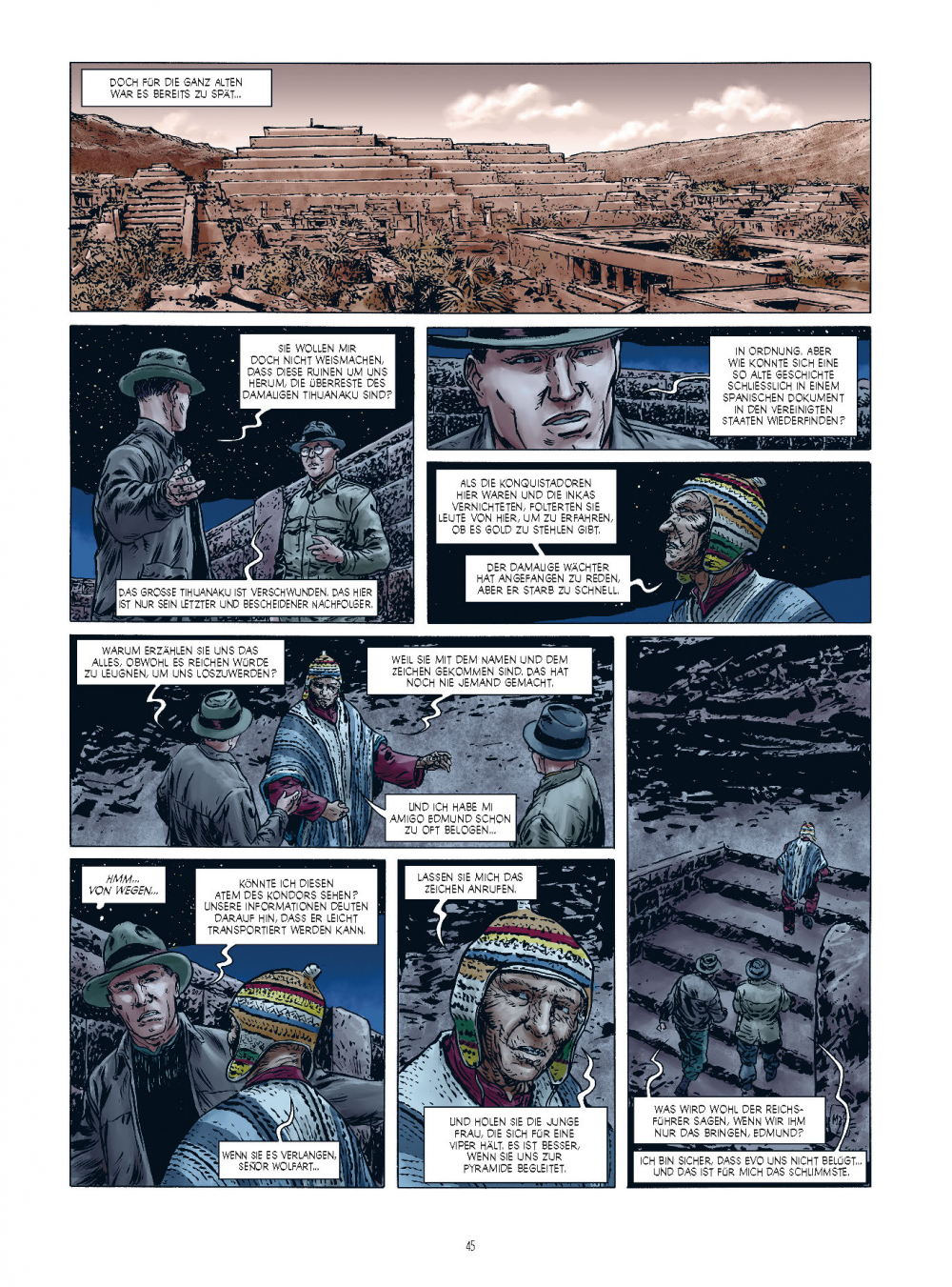 Von einer Untersuchung auf dem Panzerkreuzer Tirpitz zurückgerufen, wird der auf Problemfälle der Kriegsmarine spezialisierte Ermittler Korvettenkapitän Wolfart mit dem Nazi-Archäologen Edmund Kiß, der davon überzeugt ist, dass Tihuanaku nach einem planetaren Kataklysmus von arischen Atlantern gegründet wurde, auf den Fall angesetzt. Gemeinsam begeben sie sich auf die gefährliche Reise zur Hochebene des Altiplano…