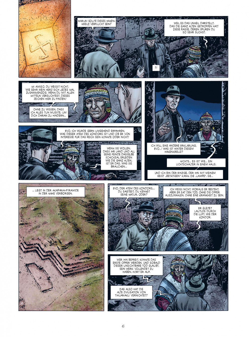 März 1946. Ein geheimes Dokument, das im Wrack eines 1865 versenkten Panzerkreuzers der Südstaatler gefunden wird, bringt die Forschungsgemeinschaft Deutsches Ahnenerbe und Himmler auf die Spur eines sagenumwobenen Schatzes, der als »Atem des Kondors« bekannt ist und in den Ruinen von Tihuanaku in Bolivien versteckt sein soll.