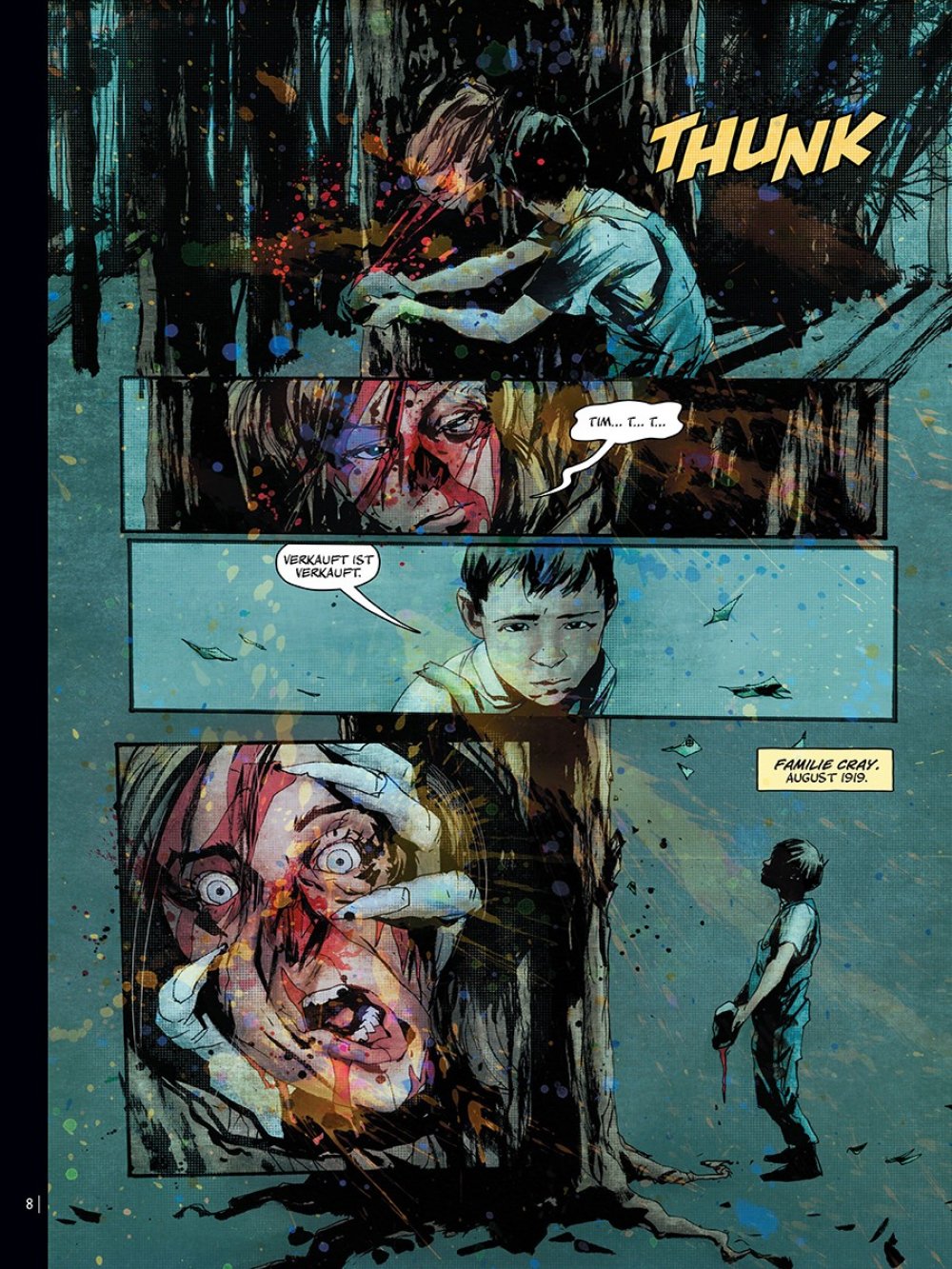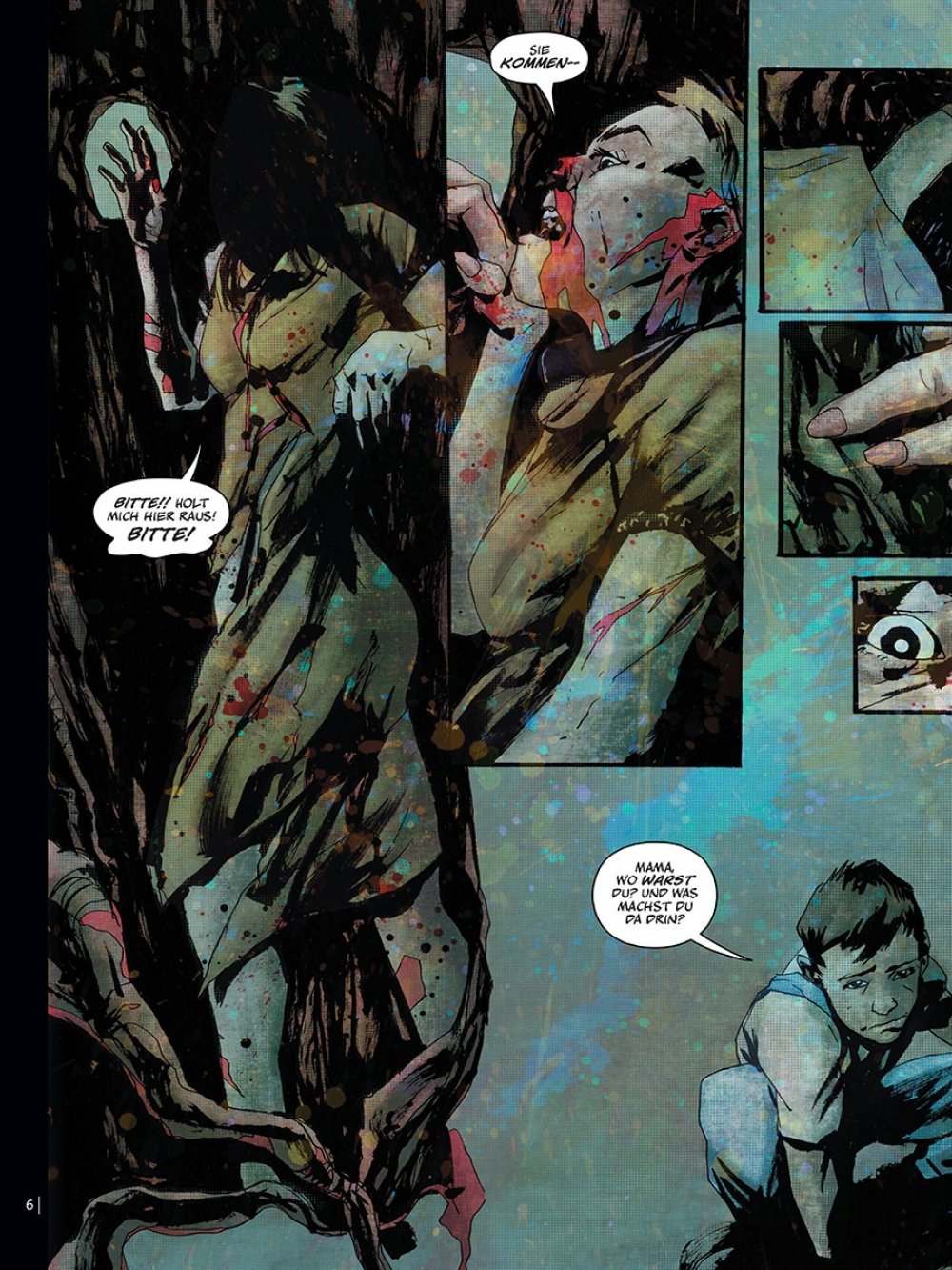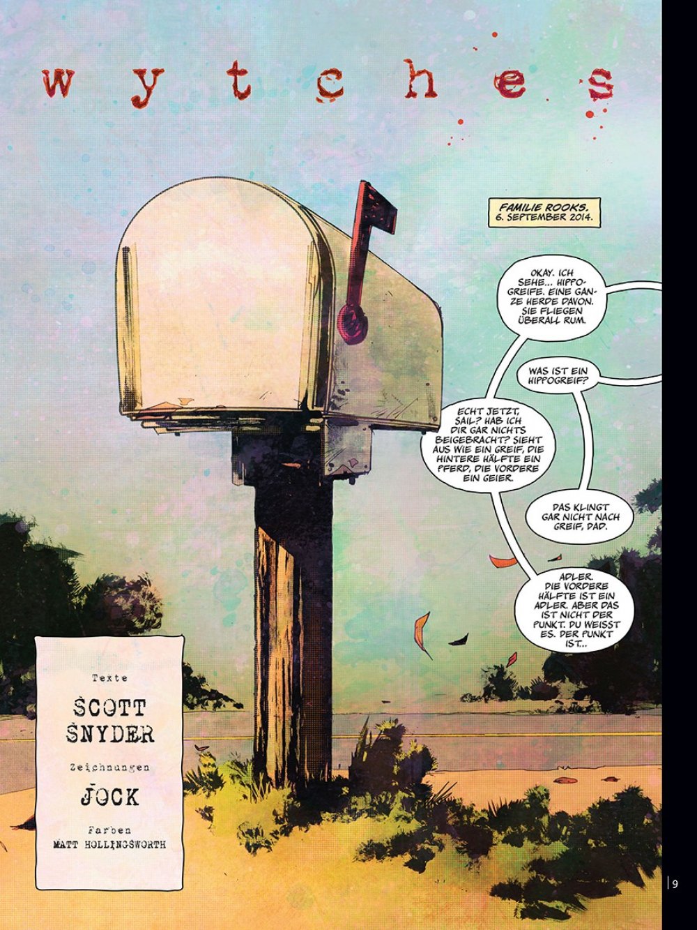 In Scott Snyders (u. a. »American Vampire«, »Batman«, »The Wake«) jüngstem Horror-Epos geht es nicht bloß ums Gruseln an sich, das Grauen reicht viel tiefer. Eine Geschichte von den Ängsten, Schuldgefühlen und Depressionen Heranwachsender, aber auch ihrer Eltern. Von Verzweiflung und der Entschlossenheit, gegen die aufkommende Panik anzukämpfen. Jock a. k. a. Mark Simpson (u. a. »Batman«, »The Losers«; Zeichnungen) und Matt Hollingsworth (»Preacher«, »Hawkeye« etc.; Farben) sorgen für eine entsprechend beklemmende, verstörende Atmosphäre – eine Story, die definitiv unter die Haut geht.