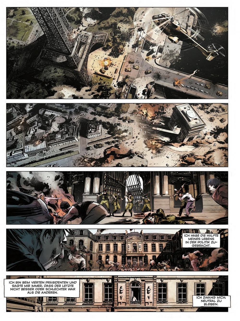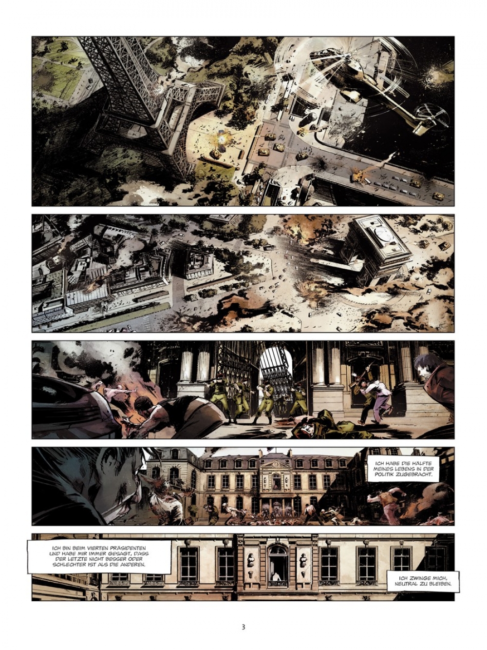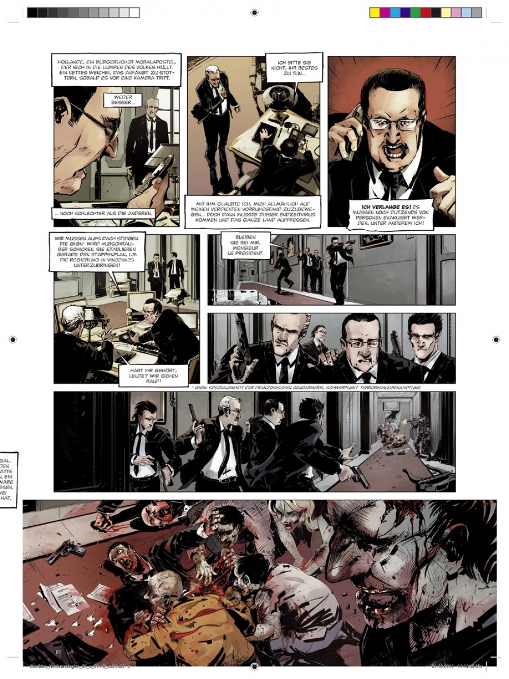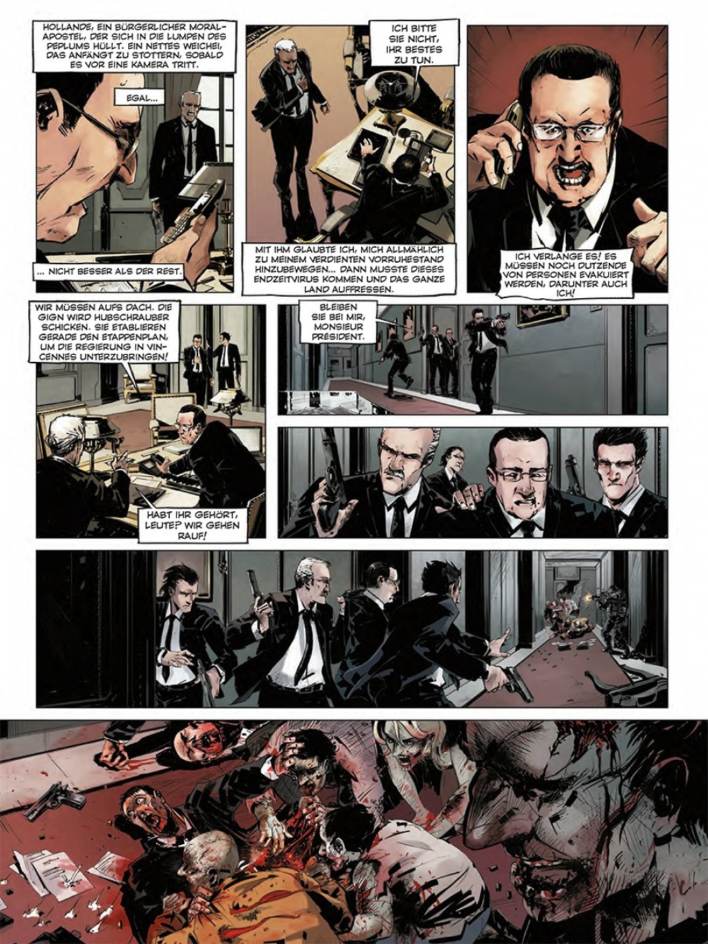 Paris. Das Virus hat die französische Hauptstadt in eine tickende Zeitbombe verwandelt. Ein massiver Exodus treibt Millionen gesunder Menschen und Zombies auf die Straßen. Das Grauen breitet sich in Europa aus wie ein Flächenbrand und keine Nation ist imstande, es aufzuhalten. Charles, langjähriger Leibwächter im Elysée, muss um jeden Preis den Präsidenten beschützen… Aber hat seine Mission überhaupt noch einen Sinn? Sind die Republik und ihr Präsident, der es eigentlich nicht verdient, dass man ihn rettet, mehr wert als sein eigenes Leben? Charles muss seinen Kampf wählen.