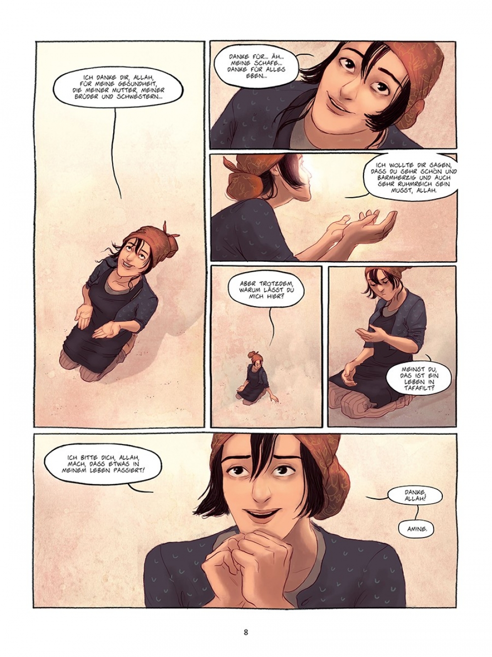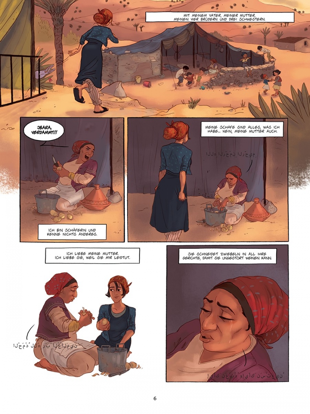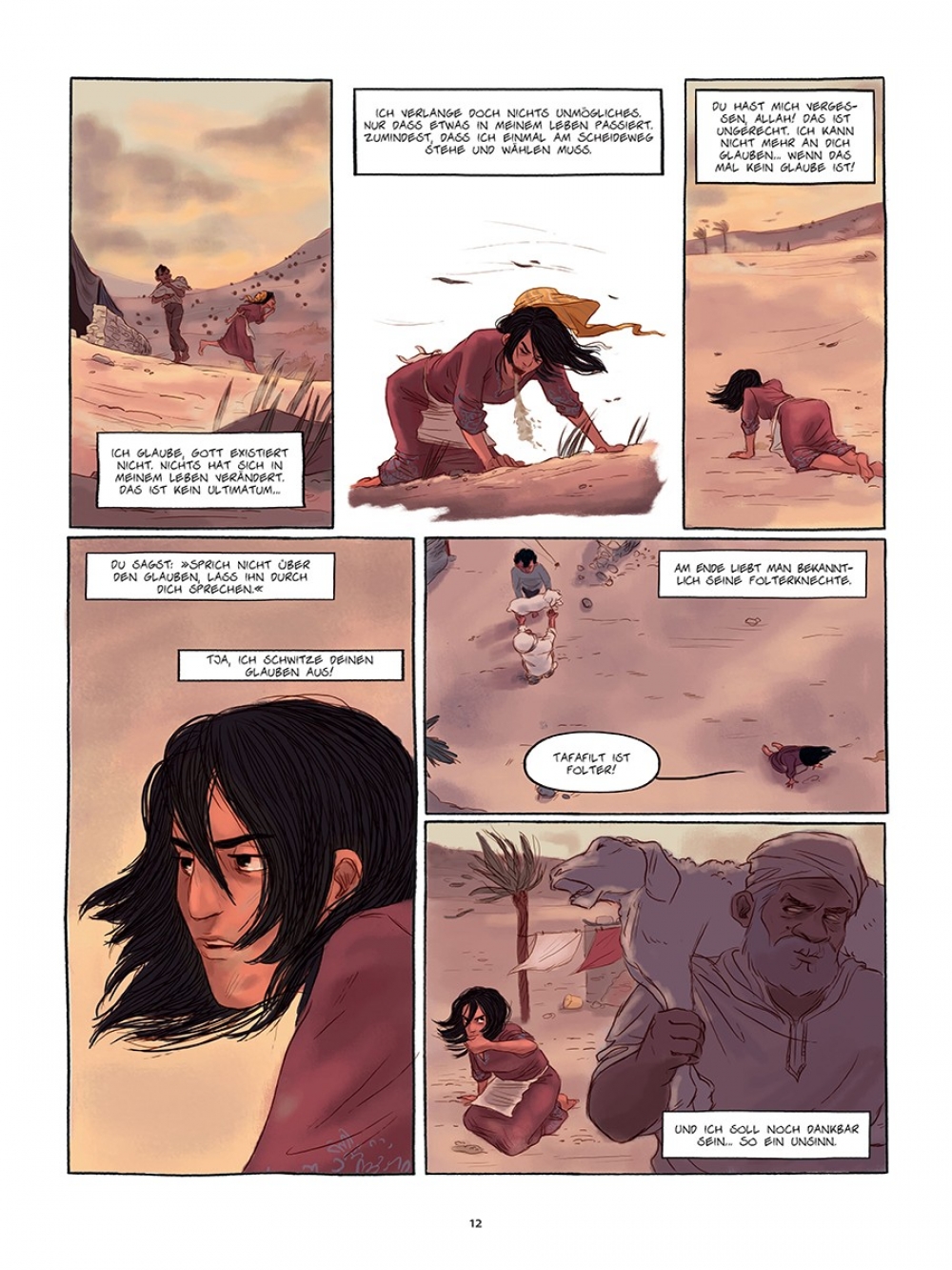 In der Comicadaption von »Zorngebete« bringt nun Eddy Simon Jbara-Kahdijas zornige und zugleich zärtliche Monologe, ihr Auflehnen gegen die verlangte Unterwerfung und ihr Vertrauen in ihren Gott konsequent auf den Punkt, der da heißt: Selbstfindung. Vor allem aber fügt Marie Avril Farbe hinzu, Landschaften, Bilder, die diesen außergewöhnlichen maghrebinischen Bildungsroman auch zu einem einzigartigen sinnlichen Erlebnis werden lassen, weitab von allen islamophoben wie -philen Klischees.