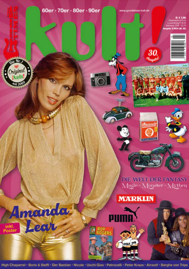 Alltags-Kult-Schaufenster - Kult-Süßigkeiten der 70er und 80er | Die Welt der Fantasy - Magie – Monster – Mythen | Der lange Weg zur Krönung - Vor 50 Jahren gewann der FC Bayern München erstmals den Europapokal der Landesmeister | Das Jahr 1984 -´Reagan, der Kaiser & das Fräuleinwunder | Graf Berghe von Trips - Der Adelige, der die Formel 1 eroberte | Scrambler - Wie das Motorrad über den Fluss, in die Wälder und an den Strand kam | Amanda Lear - Bizarres Image voller Selbstironie | Goofy - Der treue Freund von Micky Maus als Star eines eigenen Magazins | Peter Kraus - Singt und tänzelt auch mit 85 voller Energie | Fernsehabenteuer - Die großen Abenteuer aus den Anfängen des Fernsehens | Ulrich Plenzdorf - Der staatstreue Rebell | Werbe-Ikonen – Serie (Teil 16) - Das Brandt-Bübchen (Brandt-Zwieback) | TV-Charaktere – Serie (Teil 17) -Bastian Guthmann („Der Bastian”) | „Einmal voll machen, bitte!” - Über den traditionellen Mythos und das langsame Sterben der Tankstelle | Geschichten über die Strahlkraft der Werbung (Teil 2) - Die 60er Jahre | Helmut Schmidt - Der bahnfahrende Macher | Airwolf - Mit Cello und Kampfhubschrauber | Die Zeichentrickfilmserien der 80er (Teil 4) - Bravestarr | Donald Duck - Liebenswerter Loser wird 90 | Die Marke Puma & Borussia Mönchengladbach - Alte Liebe rostet nicht – Interview mit Rainer Bonhof | Nicole - Mit Liedern die Seele berühren | Petrocelli - Pick-ups, Parkuhren und jede Menge Mordprozesse | Uschi Glas - Weniger Schätzchen als gedacht | Bum Bum Boris und Steffi Graf - Unsere Tennisstars in der Werbewelt | Nervenkitzel Steilwand - Jahrmarkt-Kult mit Risiko | Panda - Ein täglicher Begleiter | Foto-Apparate und ihr Zubehör aus den 60er und 70er Jahren - Ritsch-Ratsch & Flashcubes | Schuco - Eine Legende im Spielzeugmultiversum | Fußball-Wunder-Märchen ’74 - Als die BRD gegen die DDR verlor und dennoch Weltmeister wurde | K-320- Erinnerungen an eine besondere Ranch | Milli Vanilli - Der große Grammy-Fake | Märklin-Kataloge - Nostalgische Sammlerstücke nicht nur für Eisenbahnfans | Schüleraustausch – Neugier auf das Nachbarland … - Fantastische Frankreich-Fahrten | Kegelbahnen - Alle Neune als Glückseligkeit |