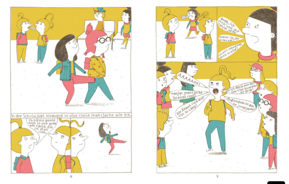 Dies ist ein Comic für Schulkinder, bei dem es um Coolness, Ausgrenzung und Freundschaften geht. Da ist die Heldin Tanja, die mit ihrer neuen Jeansjacke nicht bei allen Klassenkameradinnen auf Begeisterung stößt, aber eine gute Freundin hat, die ihr auch in schweren Minuten auf dem Pausenhof die Treue hält. Da ist auch der blöde Kai, dem sie es zumindest in ihrer Phantasie mal so richtig zeigt und da ist das Zuhause, wo es immer am schönsten ist mit einer Mama, die sie auf eine richtig krasse Idee bringt.